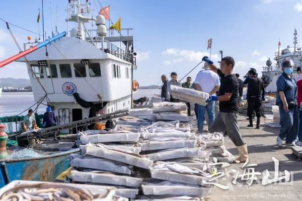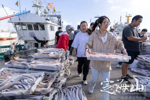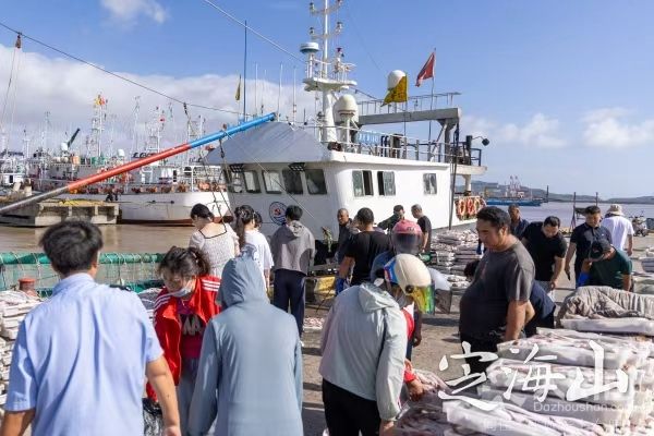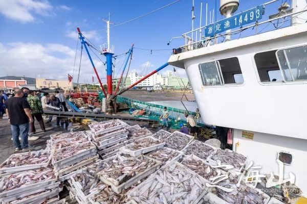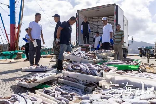 码头上,多艘满载着鱼货的渔船靠泊在码头,不同品种的冻鲜鱼货经传送装置送至岸上,引得不少市民上前问询,争相选购。岸上,渔运船工作人员忙着为鱼货称重、记录台账,运输车辆也已就绪,随时准备满载发车。